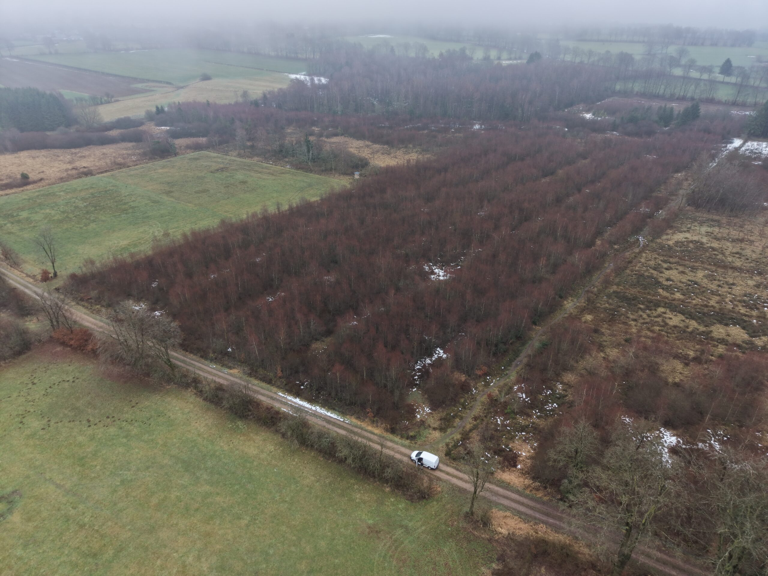 La callune (Calluna vulgaris), appelée généralement « bruyère » a besoin de lumière pour s’étendre et se développer. Une fois bien en place, elle limite la croissance des ligneux car elle couvre assez bien le sol, mais ne l’empêche pas totalement. Vous constaterez une vue aérienne prise avant les travaux ci-contre et en bas, une vue réalisée après les travaux. Avec cette réouverture, nous espérons une prolifération des callunes et autres espèces associées à la lande (bruyère quaternée, genêt des anglais, etc ..).
